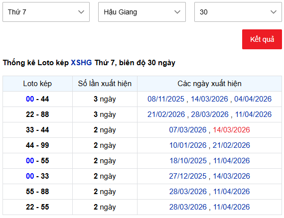Dựa trên bảng thống kê lô kép xổ số Hậu Giang trong 30 ngày gần nhất, có thể nhận thấy một số cặp số kép đang có xu hướng lặp lại và duy trì tần suất ổn định. Đây là cơ sở quan trọng để người chơi tham khảo trước kỳ quay.